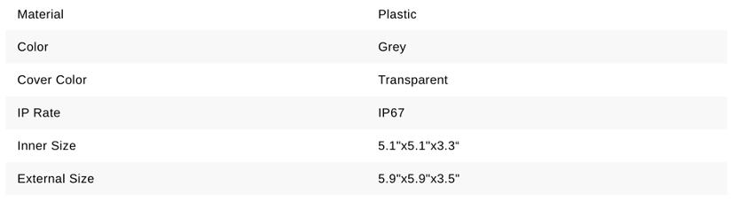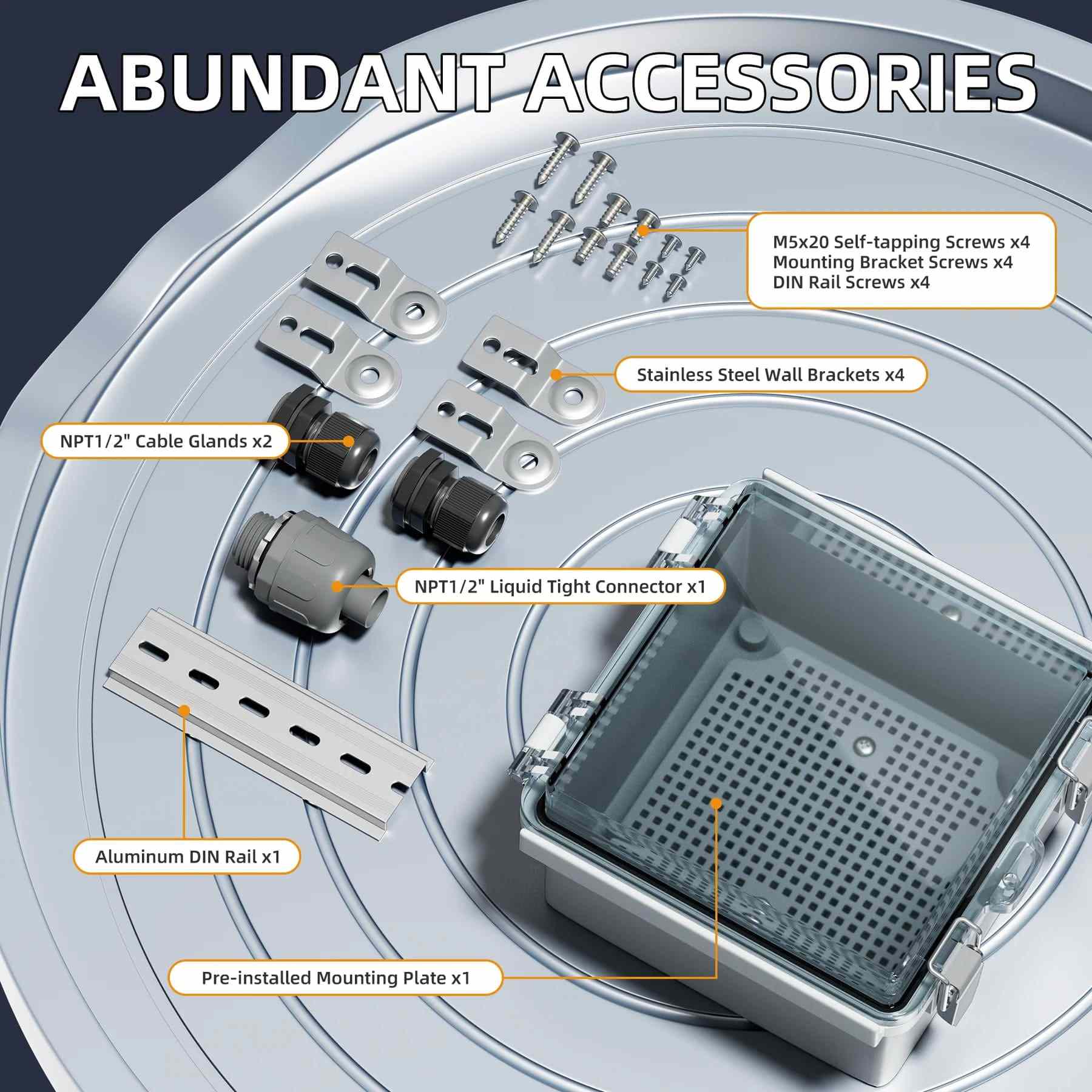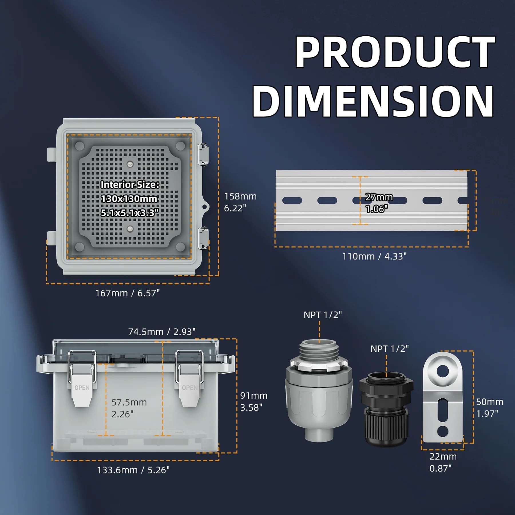 Direkayasa untuk keadaan luaran yang sukar, kandang elektrik ini menawarkan penarafan IP67, menjadikannya sangat tahan terhadap air dan debu. Ruang dalaman mengukur 5.1 "x5.1" x3.3 ", manakala luaran adalah 5.9" x5.9 "x3.5", menawarkan ruang yang cukup untuk projek pendawaian anda. Pakej ini termasuk dua kelenjar kabel NPT1/2 dan satu penyambung ketat cecair, menyelaraskan pengurusan kabel dan meningkatkan keselamatan.