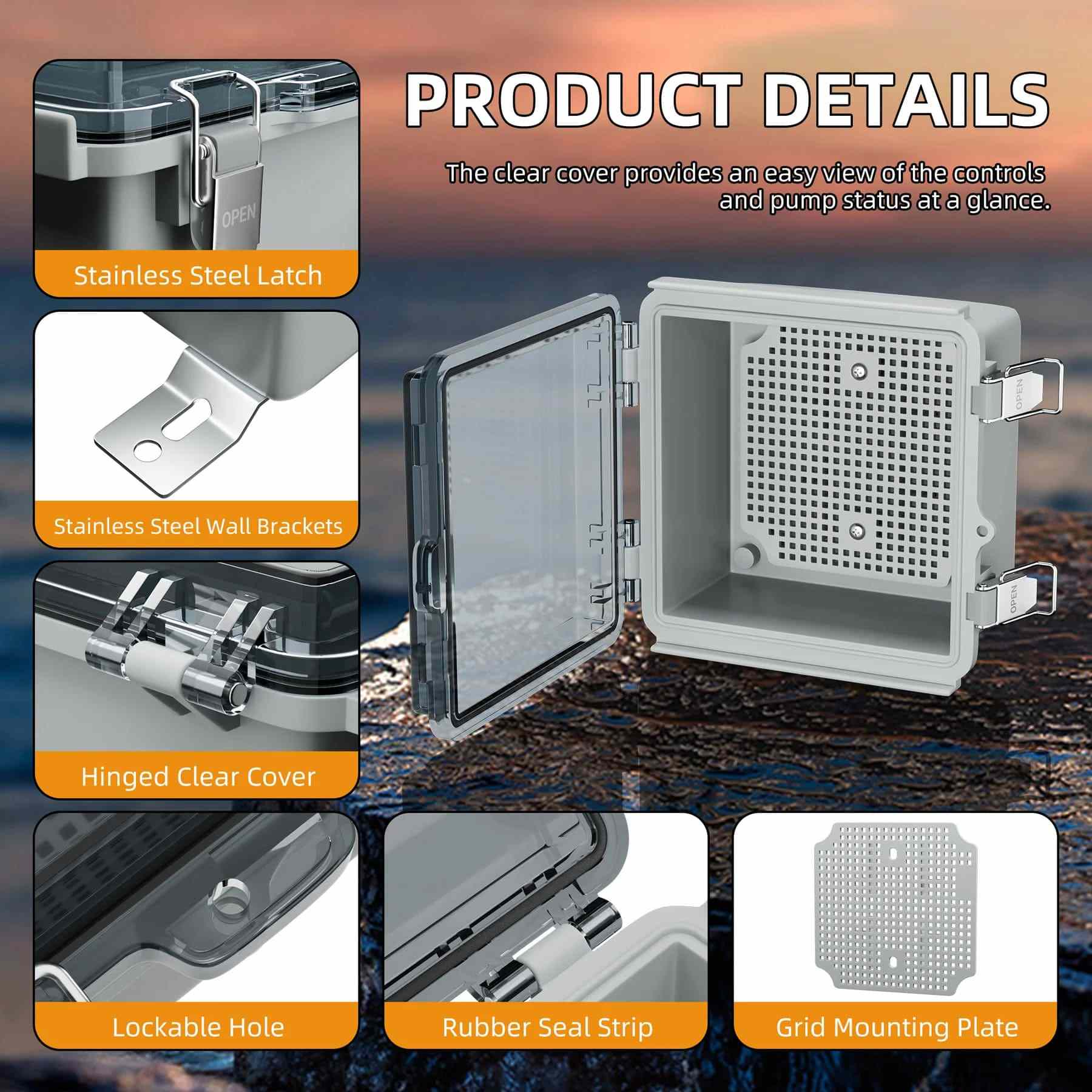 Kotak ini mempunyai selak keluli tahan karat yang mantap untuk penutupan selamat dan ketahanan jangka panjang, manakala kereta api aluminium yang disertakan memudahkan pemasangan komponen elektrik seperti suis, relay, dan pemutus litar. Dibina dari plastik ABS berkualiti tinggi, kandang ini bukan sahaja menentang faktor persekitaran yang keras tetapi juga mengekalkan prestasi isyarat WiFi yang kuat.