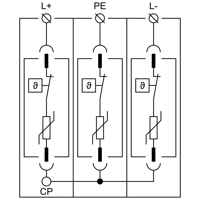 Setiap sektor varistor antara L+, L-, dan PE dilengkapi dengan pemutus haba dalaman. Pada akhir hayat varistor (terlalu panas), perjalanan pemutus untuk mengganggu arus DC dan memberikan petunjuk kesalahan yang jelas. Pembinaan pemisahan khas membolehkan pemasangan tanpa fius sandaran yang berasingan, memudahkan penyelarasan dan ruang penjimatan.